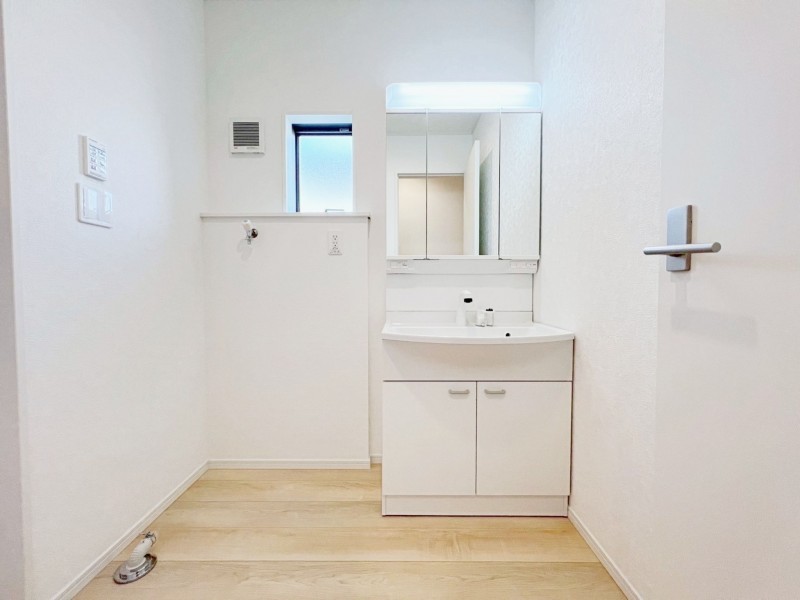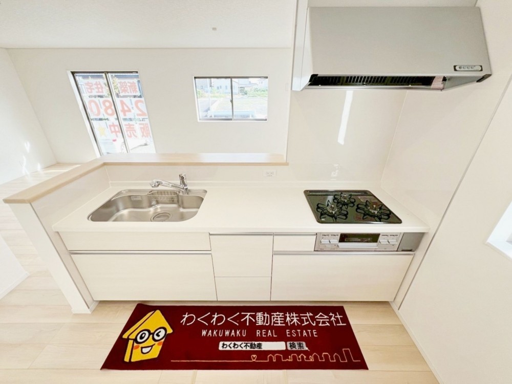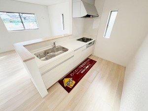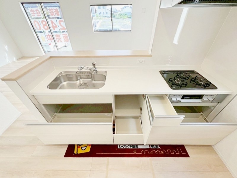 - 電気、南向き、南面バルコニー、50坪以上、接道6m以上、トイレ2箇所、システムキッチン、カウンターキッチン、洗浄便座、浴室乾燥機、シャンプードレッサー、追い焚き、複層ガラス、モニタ付インターフォン、上下水道完備、床下収納、駐車場3台分、買物便利、小学校10分以内、駅徒歩10分以内、防犯カメラ