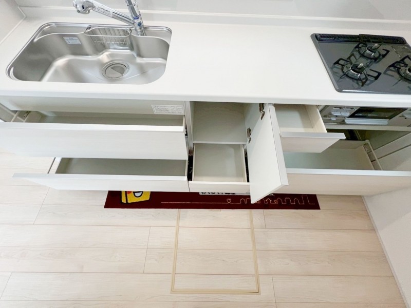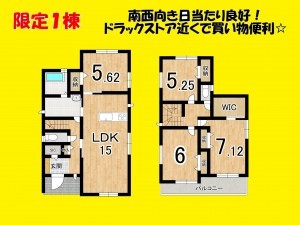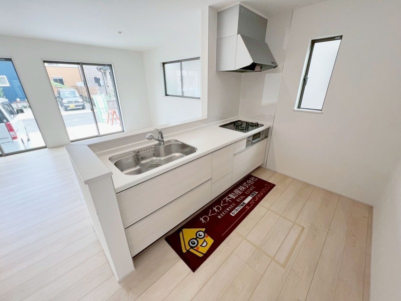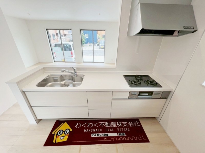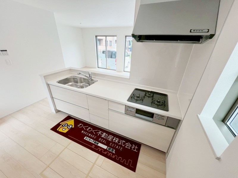 - 電気、南向き、南面バルコニー、50坪以上、トイレ2箇所、システムキッチン、カウンターキッチン、洗浄便座、浴室乾燥機、シャンプードレッサー、追い焚き、複層ガラス、ウォークインクローゼット、モニタ付インターフォン、上下水道完備、床下収納、駐車場2台分、買物便利、小学校10分以内